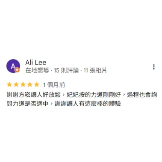 謝謝方崧讓人好放鬆,妃妃按的力道剛剛好,過程也會詢問力道是否適中,謝謝讓人有這麽棒的體驗