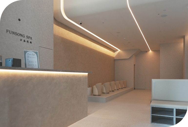 我們相信,一個能讓人真正「卸下」的空間,來自對光線與動線的精準設計。 柔光天花板延伸整個空間脈絡, 低飽和的色調與觸感細膩的材質交織,營造出有層次又不打擾的視覺體驗。