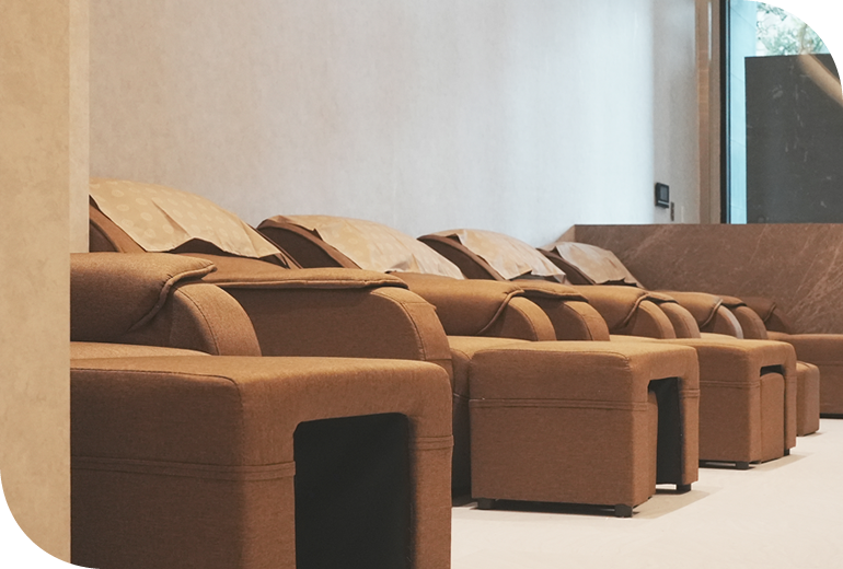 足浴區設有專屬舒適座椅與水槽,方便進行暖足與放鬆;